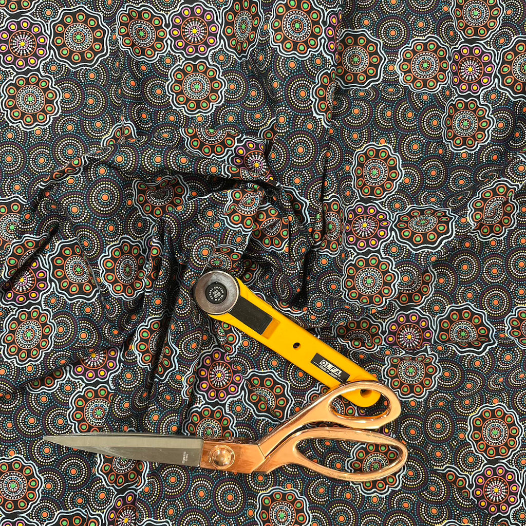 Ladies Collecting Wild Fruits blue is an Australian Aboriginal design by Jocelyn Bird that depicts the fruits and seeds in vivid circles in blues and reds on a dark background. This Australian Aboriginal fabric is printed on 100 % high thread count cotton from India. The soft hand of the fabric makes it ideal for quilting and patchwork, garments, home decor and other fabric projects.