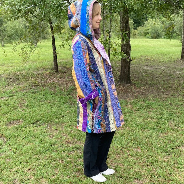 Our sample jacket size L was made with 3 Dreamtime Rolls (20) in blue, yellow and purple. For the liner, we chose three different fabrics: one for the (huge) hood - 1/2 yard, one for the inner sleeves (3/4 yard), and a third for the inner body (2.25 yards)