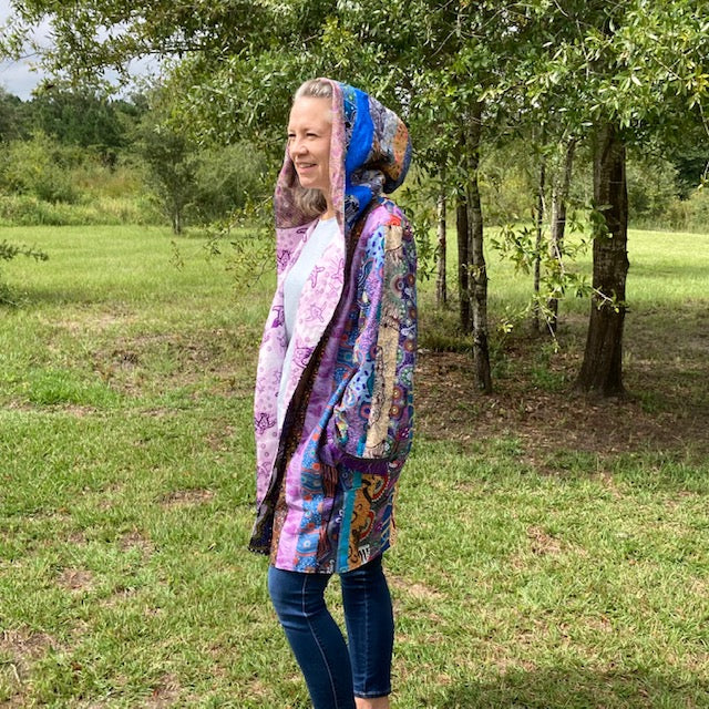 The NYLA Jacket (think New York, Los Angeles) was designed to showcase indigenous prints, and we took the idea and ran with it: Made from Australian Aboriginal fabrics by M&S Textiles Dreamtime Rolls, it is the ideal jacket for those slightly cool autumn and spring days. The HUGE hood makes it very cozy and attractive. Easy to sew, wonderful to wear - what is not to like!